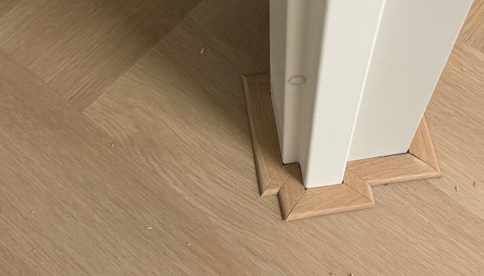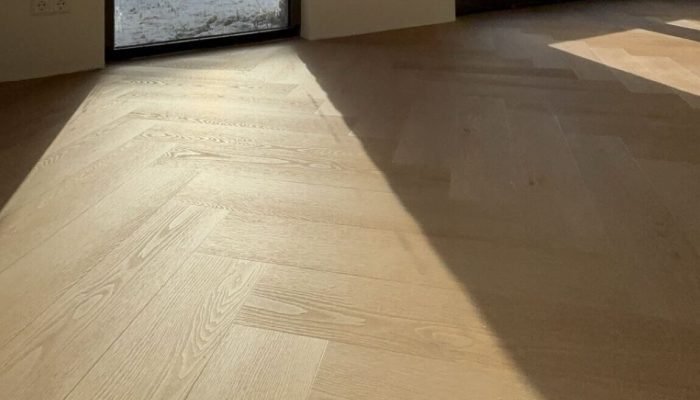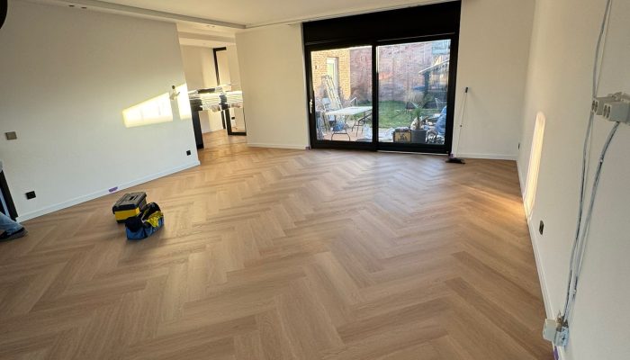 Deze visgraatvloer geeft de ruimte een luxe uitstraling, perfect afgewerkt voor een tijdloos resultaat.